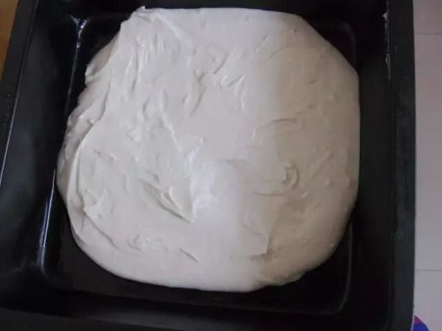 2. 找一平盘,用刷一层薄油,把搅拌均匀的面糊倒入容器内,然后放入蒸锅里大火蒸15分钟