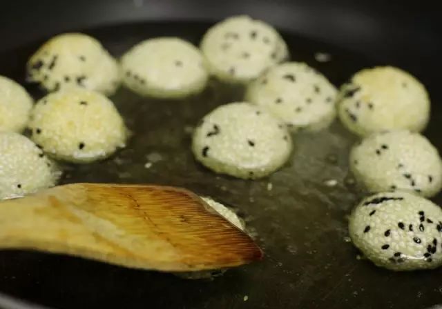 5.轻轻晃动锅,使麻团受热均匀,然后用锅铲轻轻按压,不要用力过猛,以免按破了,一边小火炸一边用力均匀地按压,按压下去过一会会膨胀,然后再轻轻按压下去,一会继续膨胀,如此反复。