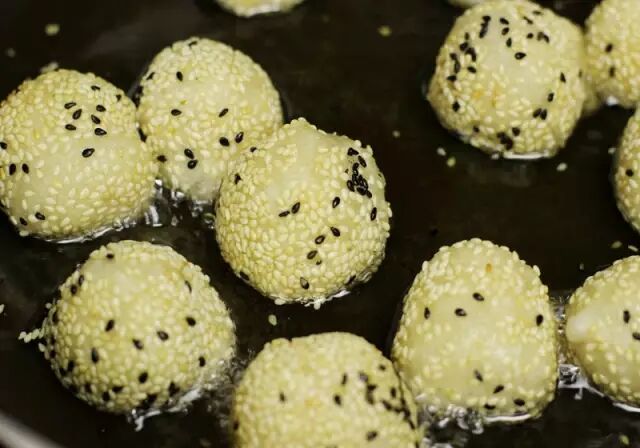 4.锅里加入足量油,用一根筷子插入油中,筷子周围冒出很多小泡的时候放入做好的麻团毛坯。