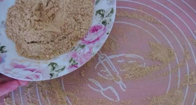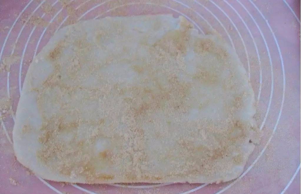 6. 把蒸好的糯米糕铺在黄豆面上,用擀面杖擀成方形的面皮