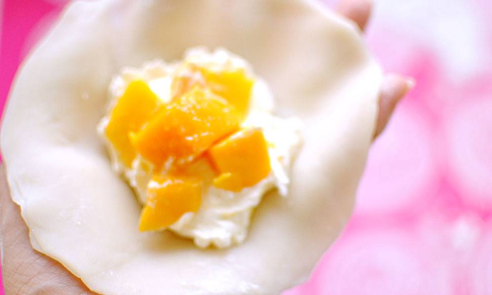 6. 将糯米团均分10份,取一份用擀面杖擀成薄片(擀面杖包一层保鲜膜,这样擀皮的时候就不会粘了),挤一层奶油,放几个芒果丁,再挤一层奶油,操作时候为了防止粘手可以在案板和手上撒些熟糕粉