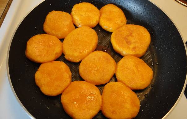 4.热锅上油,油热后,放入红薯饼生坯,小火煎至边缘略有些金黄。翻到另一面,也煎至金黄后即可