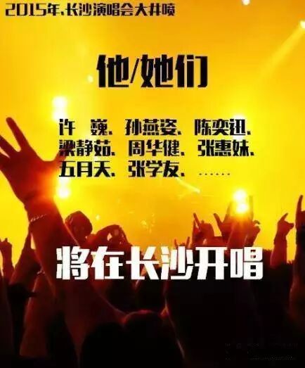 2014年长沙演唱会市场复苏,周杰伦、汪峰、邓紫棋等歌手均赚得盆满钵满。据湖南省演艺集团消息,2015年里,长沙演唱会市场将会迎来一次大井喷,几乎是一个月一次的频率,个个是大牌——3月至5月有孙燕姿、陈奕迅和许巍,梁静茹定档6-7月,9月是周华健、10月是张惠妹、11月则有一票难求的五!月!天!张学友极有可能在2015年底登陆!