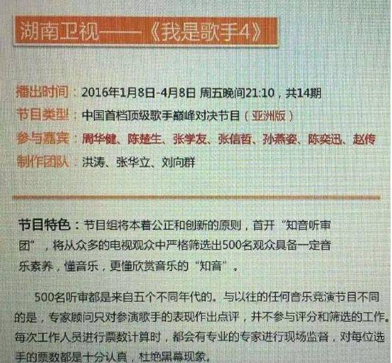 10月15日,网络流传一张《我是歌手》第四季嘉宾名单,张学友、周华健、孙燕姿、陈奕迅、陈楚生、张信哲、赵传等大咖在列。名单显示《我是歌手4》将在1月8日开播,不少网友大呼这份名单“阵容豪华到完全不靠谱”。