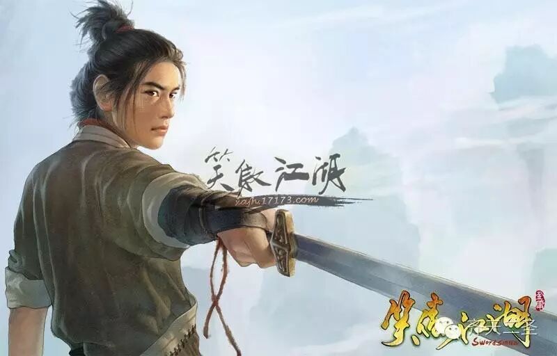(武侠网游《笑傲江湖》的宣传海报,一把利剑,行走江湖,谁与争锋。)