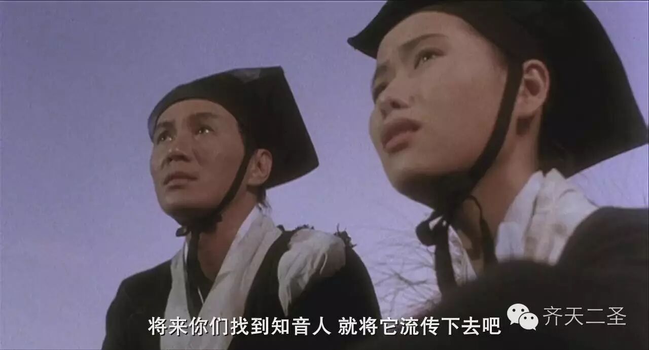 (许冠杰扮演的令狐冲和叶童扮演的小师妹岳灵珊,在岸边看着刘正风和曲洋自焚,凄伤哀婉,也希望他们临终托付的曲目能够流传下去,有更多知音人。)