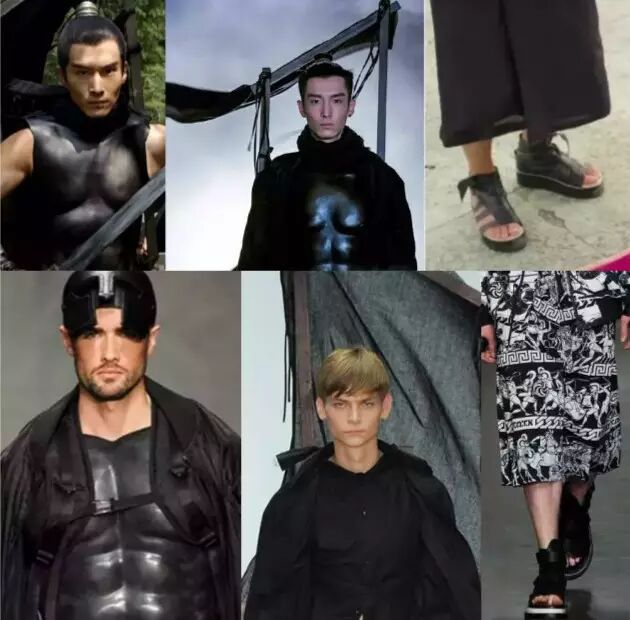 还有比如自带肚脐眼的假胸肌盔甲、凉鞋搭配薄纱裙裤、摸不着头脑的木框背带装,其实全部出自时尚大牌造型!