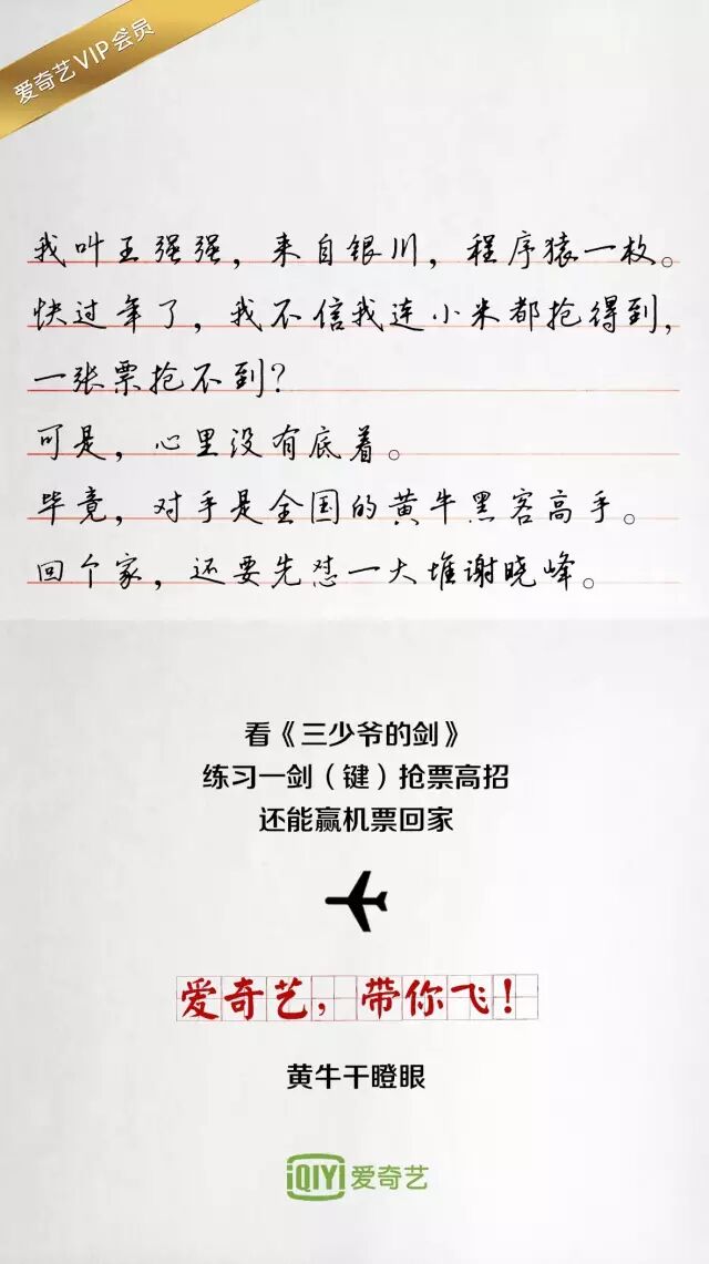 1月13日,#爱奇艺陪你回家#活动在官方微博启动,只要你转发#片单在手,说走就走#的官微,并从爱奇艺片库精心挑选的旅途片单中选择一部,留言:春运路上,我最想看XXX,@官微。17日,系统随机抽选的5名网友春运机票,将有爱奇艺埋单!机票福利不止一轮,1月20日,爱奇艺还将发布春节7天片单,相同的参与方式,大派5张免费机票福利!