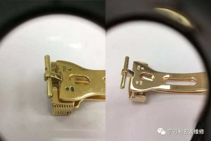 手表在佩戴的过程中不免出现划痕,或轻或重。表壳表链出现刮痕大大降低了美感。如何修复呢?作为表壳表面的工艺,基本上有两种:抛光的和拉砂的,或者两者兼有,修磨手表表壳上的划伤。表壳或表带上局部的比较深的划痕,修理之前是需要先做局部处理的,看位置,比如表壳的壳侧,甚至有可能用上精细的小锉刀,更多的是用油石。再放大镜下,仔细把较深的划痕镗平,有深度划痕的,要着重在局部先用油石做打磨。当划痕基本都被磨去磨平后,选择粒度合适的砂纸,沿着原来的拉砂纹路去磨,这是个仔细活。对于表面是抛光的工艺,那就必须使用布轮抛光机了。香港名表维修中心进行修复的案例。