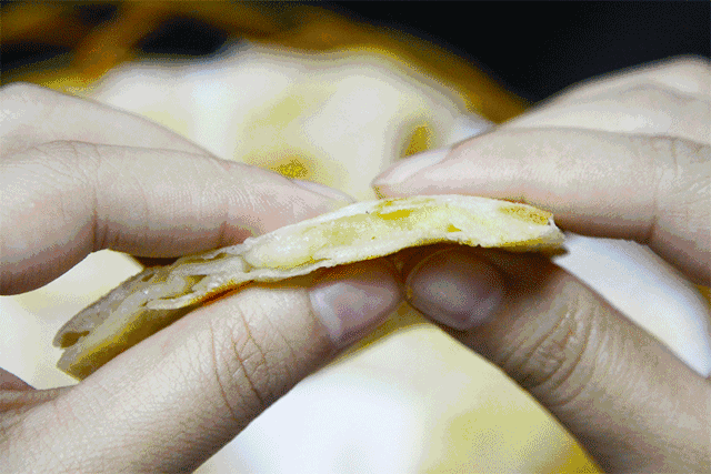 榴莲飞饼表面金黄酥脆,内里的榴莲肉满的都快溢出来了。