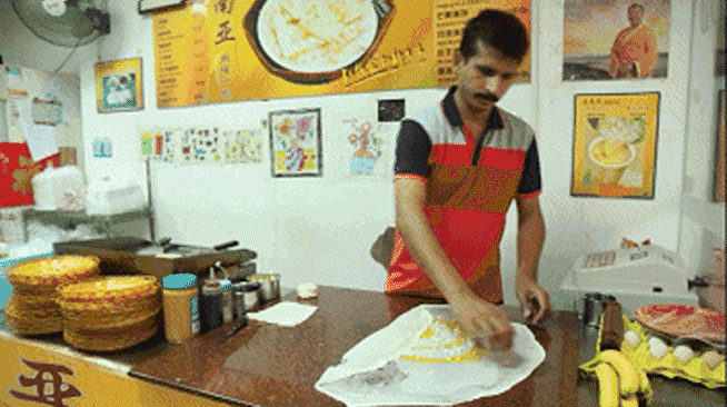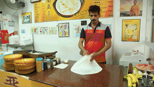 老板飞饼的手速超级快,一个面团一眨眼就变成一张大饼,把AFA的眼睛都闪花了。