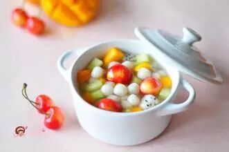 5.稍稍放凉,装入碗中,撒上各色水果丁拌匀即可食用。