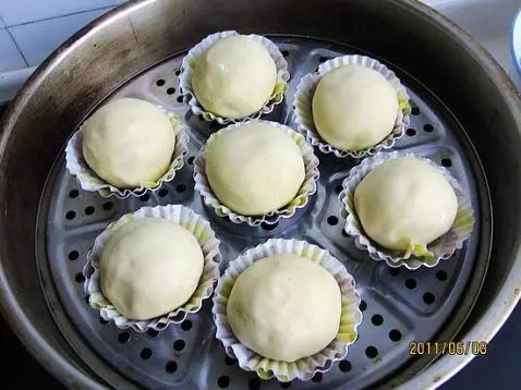 4.把面团分成小剂子,取一个,搓圆压扁,把豆沙馅放在中间。
