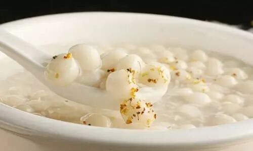 4.把小圆子沥干水,倒入,搅散。喜欢吃稠稠感觉的,用少量生粉勾个薄芡,煮开即可装碗,撒上少许干桂花。