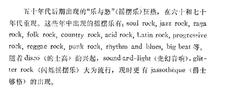 如三联书店主办的《读书》杂志上,在1980年第6期刊登了一篇《英语新词的产生与构成 为<10,000英文新字字典>写的序言》。这篇文章对摇滚乐词条有较为详细的介绍,但采用的译法为「乐与怒」和「摇摆乐」。