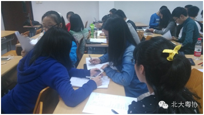 除了主讲,我们还为学员安排了助教。我们将学员分成6组,每组安排一个助教,助教坐在学员中间,方便学员提出问题,助教也能及时纠正学员的发音。不过,看来上课前刚坐下的时候,助教和学员就已经很快混熟啦。每部分教学内容结束都安排了助教和学员的讨论,看来他们已经嗨起来啦。