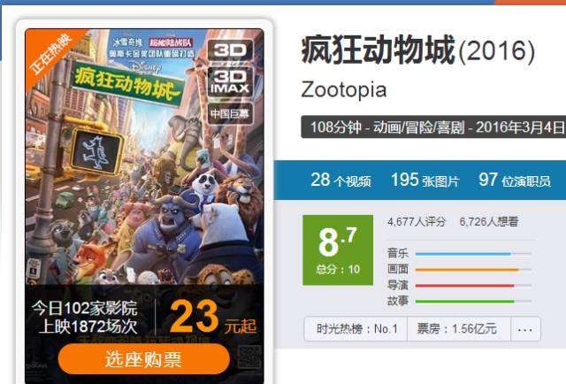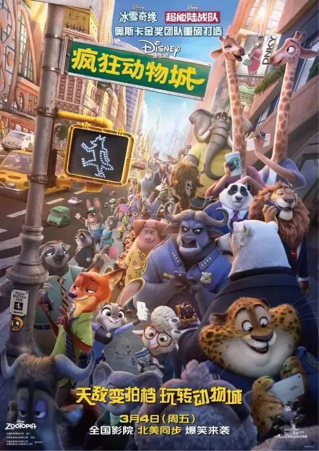 迪士尼动画电影《疯狂动物城》3月4日在中国内地公映,它的好口碑也已在全球范围内蔓延。电影讲述小镇女青年“兔朱迪”前往大城市展开寻梦之旅,与看起来一点都不和谐的“狐尼克”组全新CP,并破获一桩动物界大案的故事。电影把哺乳动物拟人化,并将兔子、狐狸、树懒、小羊这些动物独有的特点加以幽默化表现,创造了一个神似人类社会、有爱有笑有泪的奇幻城市。